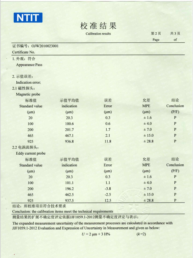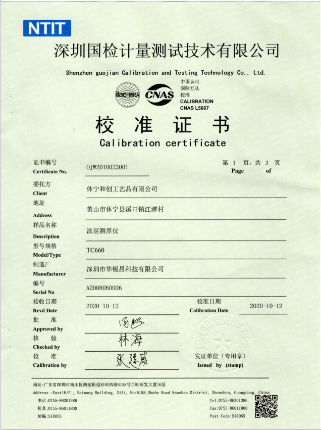 校準(zhǔn)證書-HRC華銳昌涂層測(cè)厚儀TC660