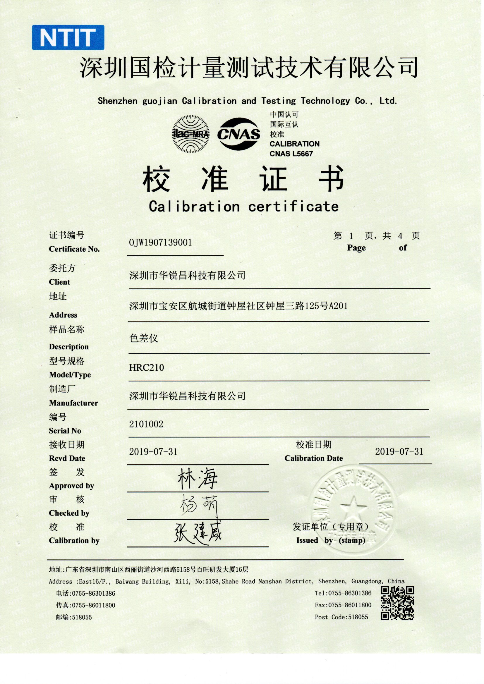 HRC華銳昌色差儀國檢檢測報告校準證書