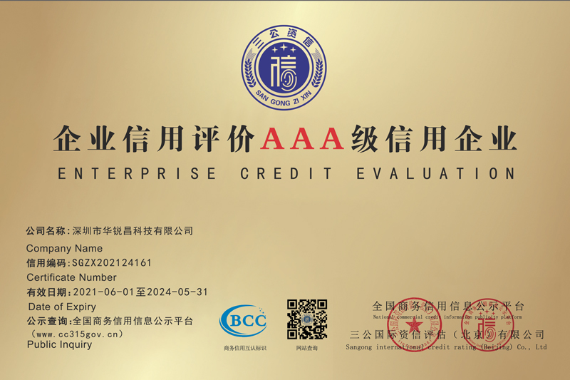 深圳市華銳昌科技有限公司的資產規模、信用記錄、管理水平、顧客滿意度、發展前景等多方面進行了嚴格、全面的分析與審核,深圳市華銳昌科技有限公司憑借優秀的品牌認知度和社會美譽度,獲得了“企業信用評價AAA級信用企業”這一重量級榮譽。