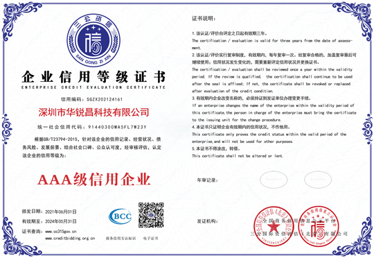 企業(yè)信用評價AAA級為企業(yè)信用評價中最高的信用等級,是對深圳市華銳昌科技有限公司實(shí)力和市場信用的認(rèn)可,表示深圳市華銳昌科技有限公司經(jīng)營良好,發(fā)展前景廣闊,風(fēng)險防范能力強(qiáng),是最可信賴的商業(yè)合作伙伴。