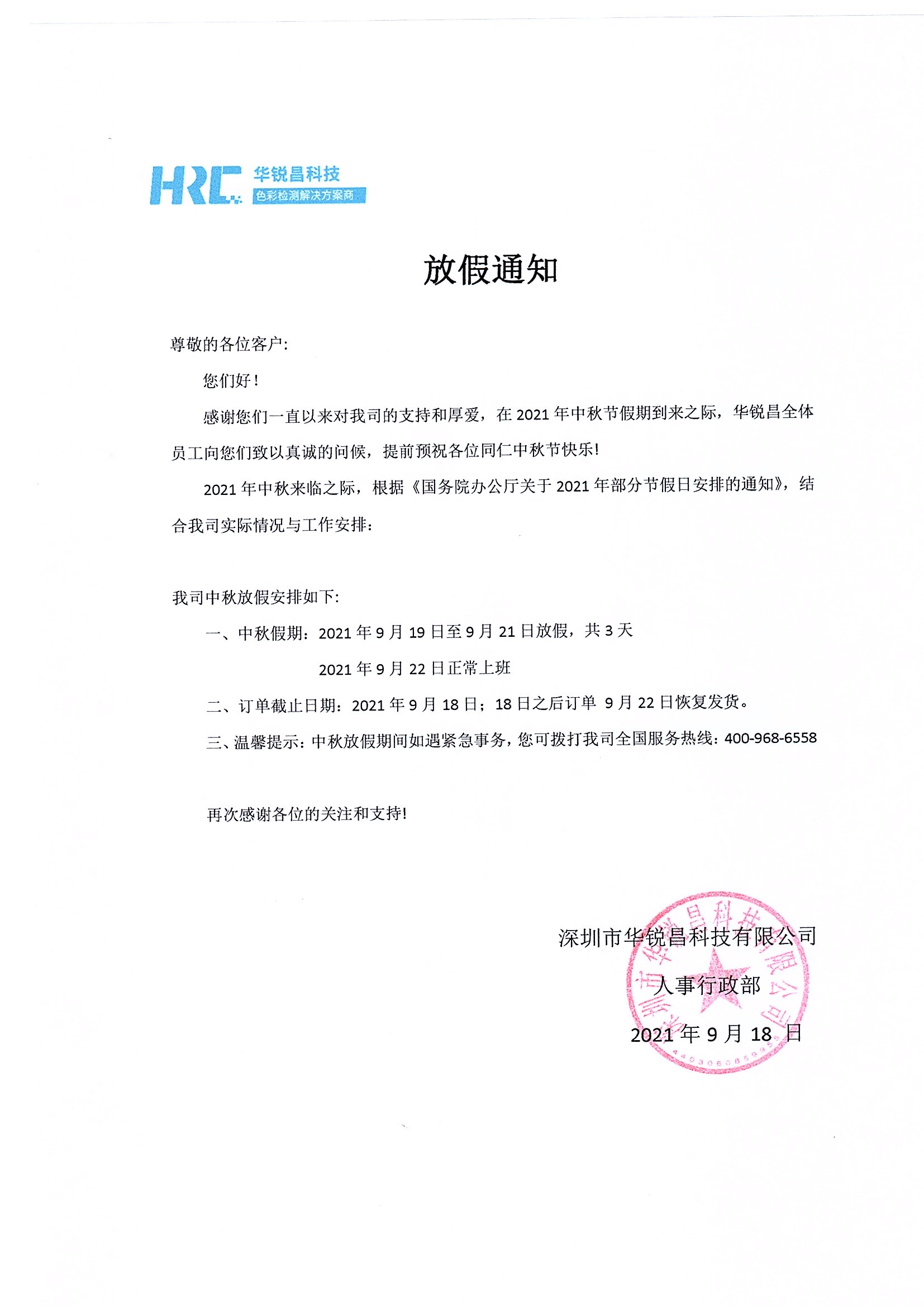感謝您們一直以來對我司的支持和厚愛,在2021年中秋節假期到來之際,華銳昌全體員工向您們致以真誠的問候,提前預祝各位同仁中秋節快樂!